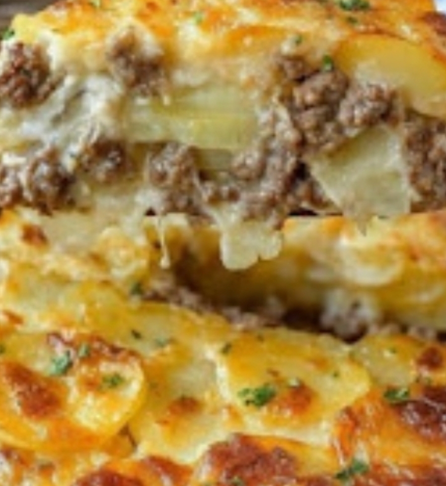 Ingredients1 lb (450 g) ground beef 1 medium onion, diced 3 cloves garlic, minced 1 teaspoon salt ½ teaspoon black pepper 1 teaspoon paprika 1 tablespoon Worcestershire sauce 4 cups thinly sliced potatoes (about 4–5 medium) 1 can (10.5 oz) cream of mushroom soup ½ cup milk 2 cups shredded cheddar cheese, divided ½ cup sour cream Chopped fresh parsley (optional, for garnish) InstructionsPreheat Oven – Heat oven to 350°F (175°C). Lightly grease a 9×13-inch (23×33 cm) baking dish. Cook Beef – In a skillet over medium heat, cook ground beef and onion until beef is browned and onion is tender (5–7 minutes). Add garlic and cook 1 more minute. Drain excess fat. Season – Stir in salt, pepper, paprika, and Worcestershire sauce. Mix well. Layer Potatoes – Arrange half the sliced potatoes in the baking dish. Build Layers – Spread the beef mixture evenly over potatoes. In a bowl, whisk together cream of mushroom soup and milk, then pour half over the beef. Sprinkle 1 cup cheddar cheese on top. Add Second Layer – Place remaining potatoes over cheese. Pour the rest of the soup mixture evenly on top. Bake – Cover with foil and bake for 60 minutes. Remove foil, sprinkle remaining cheese, and bake uncovered for 15–20 minutes, until potatoes are tender and cheese is bubbly. Finish & Serve – Let cool 5 minutes. Spread sour cream over top and garnish with parsley if desired. Serve warm. Cooking Notes & TipsEven Potatoes: Use a mandolin slicer for uniform slices so everything cooks evenly. Soup Swap: Cream of chicken soup can be used instead of mushroom for a different flavor. Meat Options: Substitute ground turkey or chicken for a lighter version. VariationsBacon Cheeseburger Casserole – Add crispy bacon to the beef mixture. Veggie Boost – Mix in 1 cup frozen vegetables or sliced bell peppers. Spicy Kick – Add red pepper flakes or diced jalapeño to the beef. FAQsCan I make it ahead?Yes! Assemble up to the baking step, cover, and refrigerate up to 24 hours. Add 10–15 minutes extra bake time if chilled. How to store leftovers?Refrigerate in an airtight container for up to 3 days. Reheat in the microwave or oven. Can I freeze it?Yes—freeze before or after baking. Wrap tightly and store up to 3 months. Thaw in fridge overnight before reheating. What to serve with it?It’s hearty on its own, but pairs perfectly with salad, steamed veggies, or garlic bread. 👉 This Cheesy Hamburger Potato Casserole is everything you love about a home-cooked meal—warm, filling, and full of flavor. Once you try it, it might just become a new family favorite!