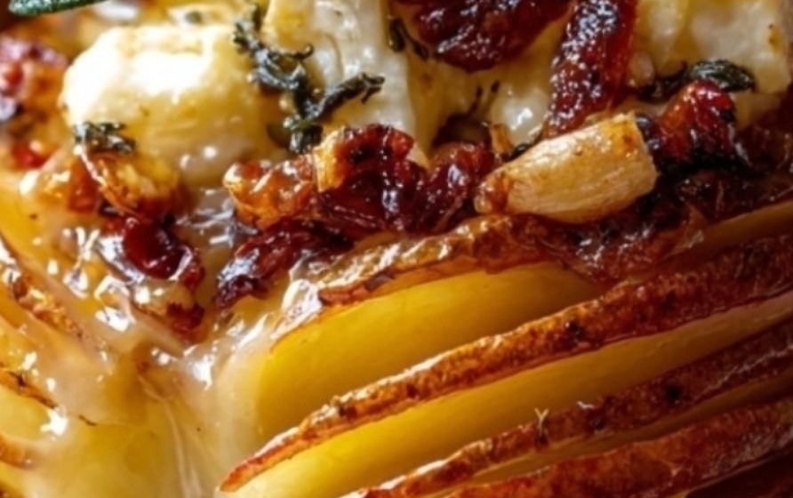 Ingredients: 4 medium apples (Granny Smith or Honeycrisp work well) 1/2 cup Brie cheese, sliced 1/4 cup prosciutto or any other charcuterie (like salami or ham), chopped 1/4 cup walnuts, chopped 1 tablespoon honey 1 tablespoon fresh thyme 1 tablespoon olive oil Salt and pepper to taste Instructions: Preheat the oven to 375°F (190°C).Cut the apples into Hasselback style slices, making sure not to cut all the way through, leaving the bottom intact.Place the apples on a baking dish and drizzle with olive oil, then season with salt and pepper.Stuff each slit with a slice of Brie cheese and a small piece of charcuterie (prosciutto or your choice of meat).Sprinkle the chopped walnuts and fresh thyme over the top of the apples.Drizzle honey over the apples for a touch of sweetness.Bake in the preheated oven for about 25-30 minutes, or until the apples are tender and the cheese has melted.Once baked, garnish with extra fresh thyme and serve warm.Enjoy this savory, sweet, and cheesy Hasselback apple bake!