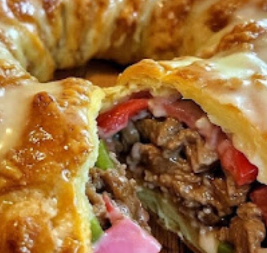 Ingredients1 tbsp olive oil 1 medium onion, thinly sliced 1 green bell pepper, thinly sliced 1 red bell pepper, thinly sliced 1 lb beef steak strips Salt & black pepper, to taste 1 tsp garlic powder 1 tsp Worcestershire sauce 1 cup provolone cheese, grated 2 boxes crescent roll dough Fresh parsley, for garnish (optional) InstructionsPreheat OvenPreheat to 375°F (190°C). Line a baking sheet with parchment paper for easy cleanup. Sauté VegetablesHeat olive oil in a large skillet over medium heat. Add onion and bell peppers. Cook 5–7 minutes until softened and lightly caramelized. Cook the SteakPush veggies to the side. Add steak strips, season with salt, pepper, and garlic powder, and cook 3–5 minutes until browned. Stir in Worcestershire sauce, then combine with the veggies. Build the RingArrange crescent roll triangles in a circle on the baking sheet, overlapping the wide ends with the points facing outward to form a ring. Fill & FoldSpoon steak and veggie mixture around the wide ends of the dough. Sprinkle generously with provolone. Fold pointed ends over the filling and tuck underneath to seal. BakeBake 20–25 minutes, or until the crescent dough is golden brown and fully cooked. ServeGarnish with fresh parsley, slice into portions, and enjoy warm. Serving IdeasPair with a creamy horseradish dip or garlic aioli. Serve alongside a fresh green salad or fries for a full meal. Perfect centerpiece for game nights, potlucks, or family gatherings!