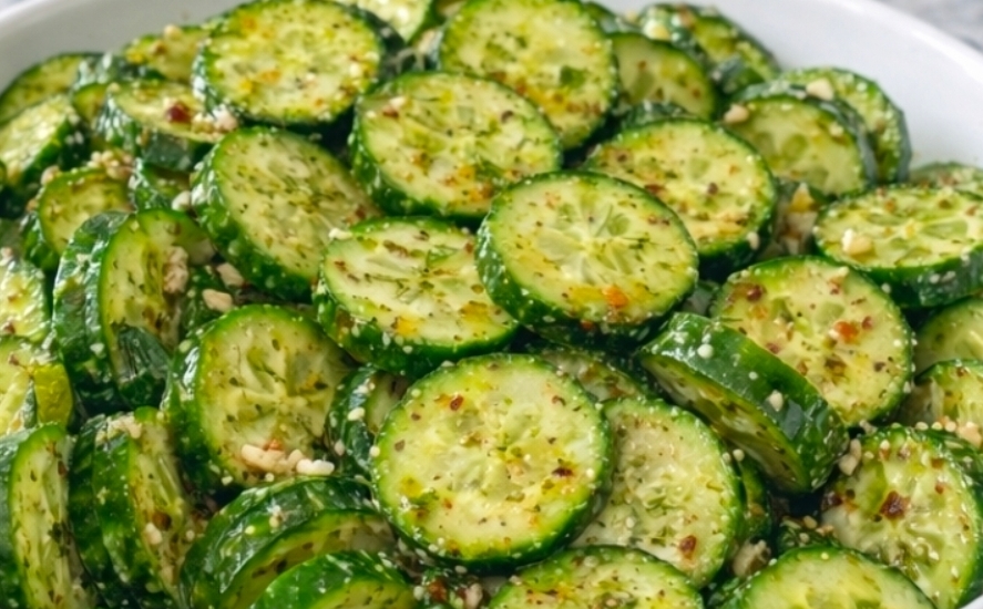 If you’re looking for a fresh, flavorful snack that’s low in calories but big on taste, this Zero Point Cucumber “Bang” recipe is about to become your new obsession. Inspired by viral healthy snack trends, this simple cucumber dish delivers a bold, tangy kick with every bite. It’s crunchy, refreshing, and coated in a perfectly balanced blend of spices that wake up your taste buds instantly. Best of all, it’s incredibly easy to prepare using just a handful of ingredients you likely already have at home. This recipe is perfect for anyone following a healthy lifestyle, weight management plan, or simply looking for a quick snack that doesn’t compromise on flavor. Whether you enjoy it as a midday pick-me-up, a side dish, or even a light appetizer, this cucumber “bang” salad hits all the right notes. Preparation Time: 10 minutesChilling Time: 20–30 minutes (recommended for best flavor)Total Time: 30–40 minutesServings: 4 This quick cucumber snack requires no cooking, making it ideal for busy days or when you want something fast and satisfying. The chilling time allows the cucumbers to absorb all the delicious flavors, enhancing the overall taste experience. Ingredients:4 cups fresh cucumbers, sliced into thick rounds2 cloves garlic, finely minced1 tablespoon low-sodium soy sauce1 tablespoon rice vinegar or apple cider vinegar1 teaspoon sesame oil1/2 teaspoon chili flakes (adjust to taste)1/2 teaspoon black pepper1/2 teaspoon salt (optional, depending on preference)1 teaspoon everything bagel seasoning or sesame seeds1 teaspoon fresh dill or parsley, choppedThese ingredients work together to create a bold, tangy, and slightly spicy flavor profile that transforms simple cucumbers into something irresistible. Instructions:Start by washing your cucumbers thoroughly and slicing them into thick, even rounds. Keeping them slightly thick helps maintain that satisfying crunch after marinating. Place the cucumber slices into a large mixing bowl or a container with a lid, similar to the one shown in the image. This makes it easier to toss everything together evenly. Add the minced garlic, soy sauce, vinegar, sesame oil, chili flakes, black pepper, and salt. Sprinkle in the seasoning blend and fresh herbs for an extra burst of flavor. Mix everything thoroughly until the cucumbers are well coated. You can either use a spoon or simply close the container and shake it well for an even distribution of the dressing. For the best results, let the mixture sit in the refrigerator for at least 20 to 30 minutes. This allows the cucumbers to soak up all the zesty, garlicky flavors and develop that signature “bang” taste. Before serving, give the cucumbers one final toss. Taste and adjust seasoning if needed, adding more chili flakes if you prefer extra heat. Why This Zero Point Cucumber Snack Works This recipe stands out because it combines simplicity with bold flavor. Cucumbers are naturally hydrating, low in calories, and packed with nutrients, making them an excellent base for a healthy snack. The addition of garlic, vinegar, and spices enhances their natural taste without adding unnecessary calories. The balance between tangy vinegar, savory soy sauce, and spicy chili flakes creates a flavor explosion that keeps you coming back for more. The sesame oil adds a subtle richness, while fresh herbs brighten the entire dish. Health Benefits of This Recipe One of the biggest advantages of this cucumber “bang” recipe is that it fits perfectly into a healthy eating plan. Cucumbers are high in water content, helping keep you hydrated and full. They are also low in calories, making this snack ideal for weight management. Garlic is known for its immune-boosting properties, while vinegar can support digestion. The spices not only enhance flavor but may also help boost metabolism. This makes the recipe not only delicious but also functional, supporting your overall wellness goals. Tips for the Best FlavorUse fresh, firm cucumbers for the best crunch. English cucumbers or Persian cucumbers work particularly well because they have fewer seeds and a smoother texture. Adjust the spice level to your preference. If you enjoy a stronger kick, increase the chili flakes or even add a dash of hot sauce. Letting the cucumbers marinate is key. While you can eat them immediately, the flavor becomes much more intense after chilling. For extra texture, you can add thinly sliced onions or crushed peanuts for a slight crunch variation. Serving Ideas This Zero Point Cucumber “Bang” recipe is incredibly versatile. Serve it as a side dish with grilled chicken, fish, or rice bowls. It also pairs well with sandwiches or wraps, adding a refreshing contrast to heavier meals. You can even enjoy it as a light evening snack when you want something satisfying without feeling guilty. Storage TipsStore any leftovers in an airtight container in the refrigerator. They will stay fresh for up to 2 days. Keep in mind that the cucumbers may release some water over time, but a quick toss before serving will bring everything back together. Avoid freezing this dish, as cucumbers lose their texture when thawed. Final ThoughtsThis Zero Point Cucumber “Bang” recipe proves that healthy eating doesn’t have to be boring. With minimal ingredients and almost no effort, you can create a snack that’s bursting with flavor, refreshing, and incredibly satisfying. If you’re searching for an easy, low-calorie, high-flavor snack, this recipe checks every box. Try it once, and it will quickly become a staple in your kitchen.